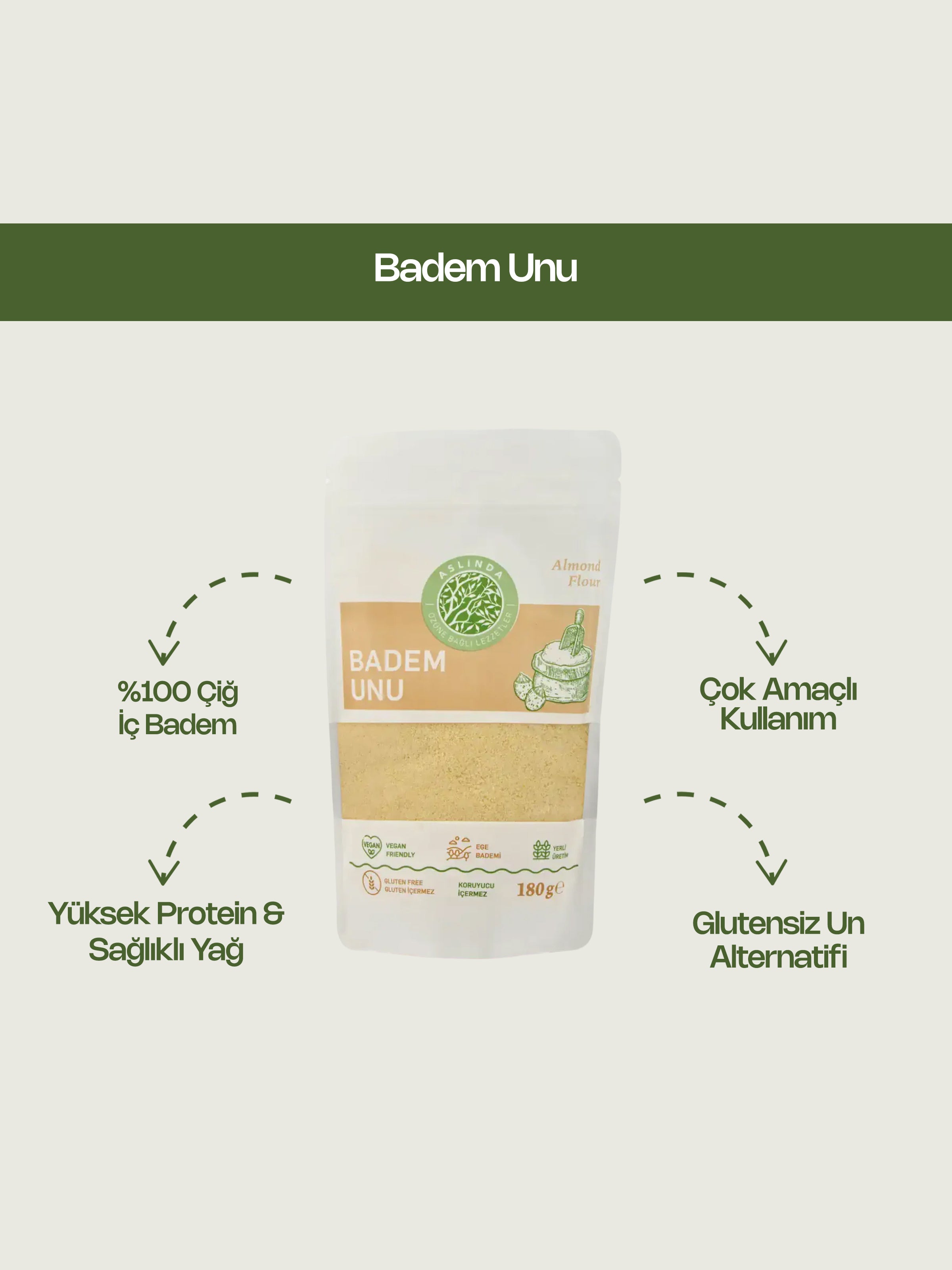 Badem unu, yüksek protein ve sağlıklı yağ içeriğiyle tamamen doğal ve katkısız olarak mutfaklarımızda yer ediniyor. Hem besleyici hem de lezzetli bir seçenek. Kekten, kurabiye ve ekmekten, pankeklere kadar tariflerde buğday ununun yerine rahatlıkla kullanabilirsiniz. Kahvaltılarda, tatlılarda veya atıştırmalıklarda da kolayca yer verebilirsiniz. Her kaşıkta hem sağlığı hem de doğal tadı hissedeceksiniz.