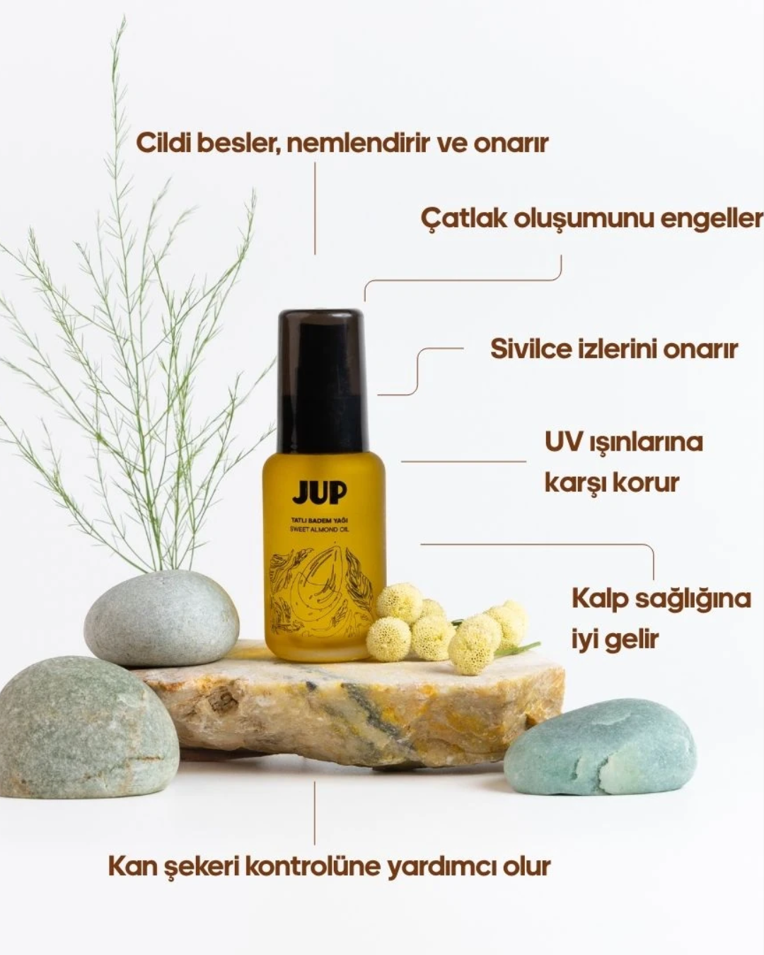 Jup’un kendi bahçesinde yetiştirdiği yerli Ferragnes bademlerinden soğuk sıkım yöntemiyle elde edilmiştir.